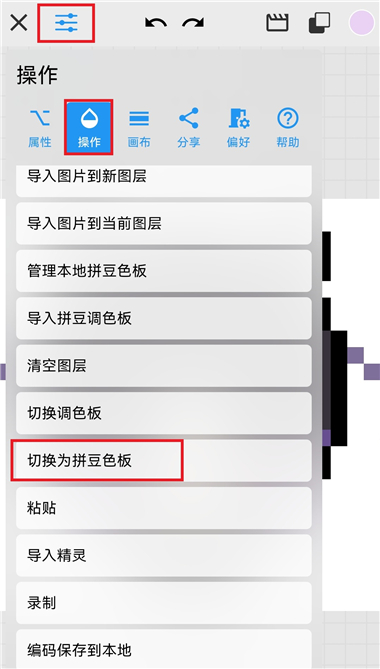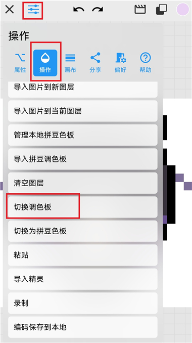 1)在编辑页面点击上方三根横线的按钮,选择【操作】,往下滑可以看到【切换调色板】这个选项,点击。