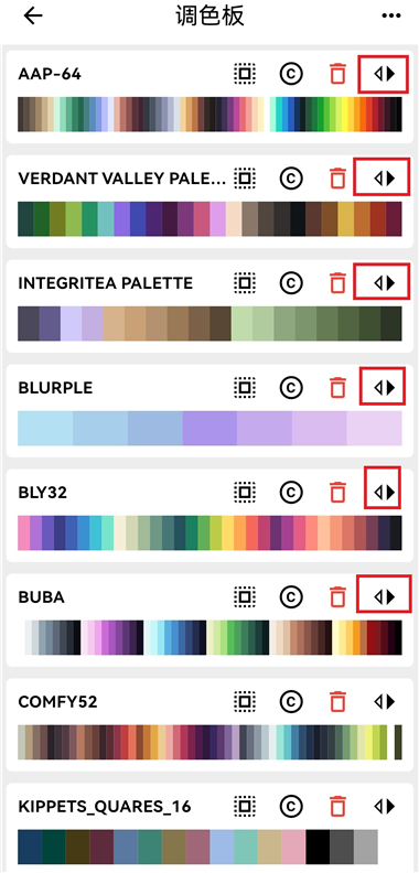 3)点击后就会自动导入不同的调色板,点击调色板右边第一个黑白三角形就能切换使用了。