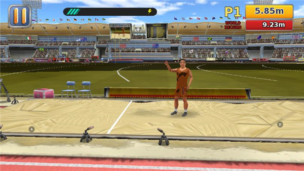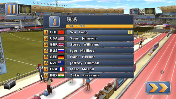 2、进入比赛之后,可以看到需要参赛的名单,来自各个不同的国家,接下来以跳远为例为各位小伙伴介绍一下游戏的玩法。