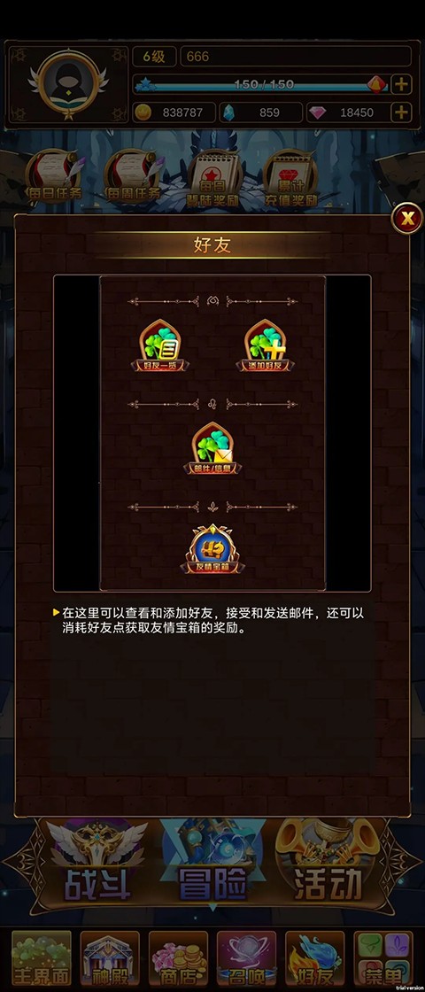 6、好友:支持好友助战,好友聊天,消耗友情点可兑换道具宝箱。