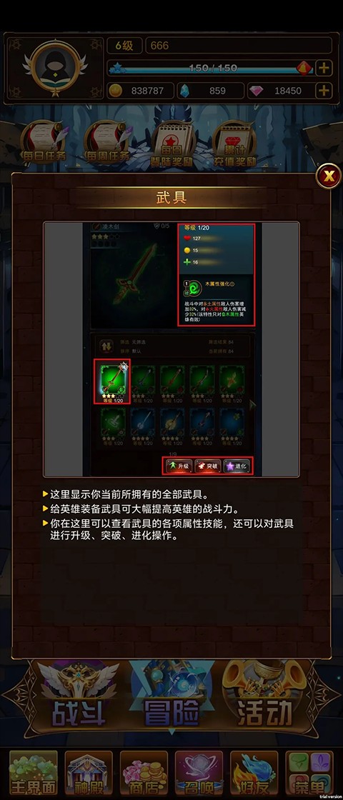 2、武具:每种武器都对应一种专属效果,与英雄角色或属性匹配可激活专属效果,大幅提升战斗力。