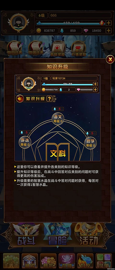 4、知识升级:30种不同的知识类型,升级可提高战斗中答题的加成效果。