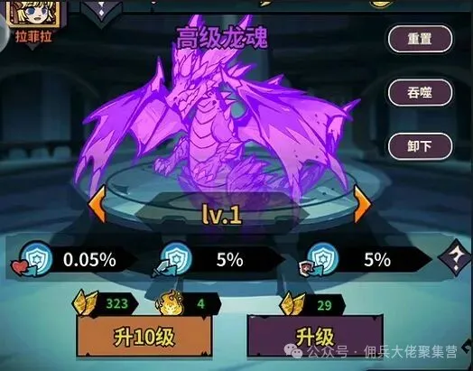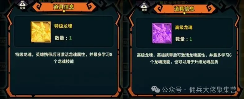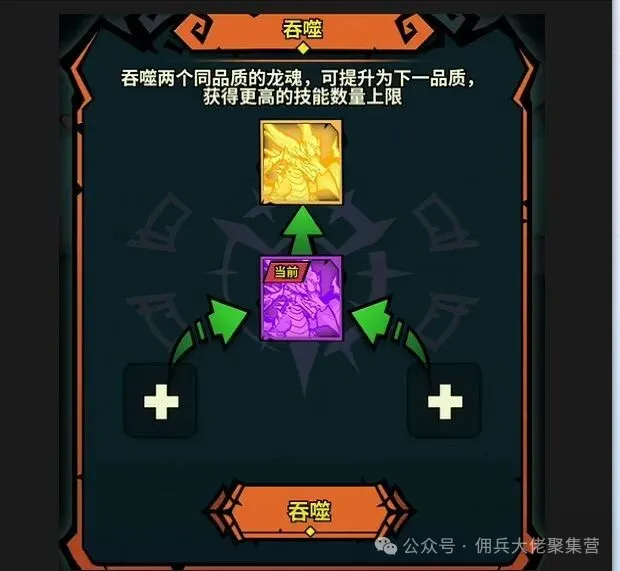 提升龙魂品质需吞噬2个同等级龙魂,即3个低阶龙魂可合成1个更高阶的龙魂。龙魂支持卸下与重置,但其技能仅能通过覆盖方式调整,无法像宠物技能那样自由拆卸。