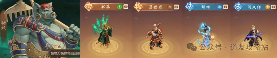 猪妖的特性是每回合免除前两次受到的伤害,这个不太好针对,小师妹推荐道友们选择输出混搭连击的阵容。