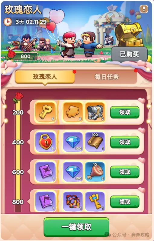 奔奔王国玫瑰花可以赠人并进行排名,但是没有爆料排名的皮肤,所以大概率是没有赠花活动。爱情钥匙不仅可以免费获取,还能通过购买礼包获取,具体购买方案和兑换推荐,我们等活动正式上线后再给大家解答。