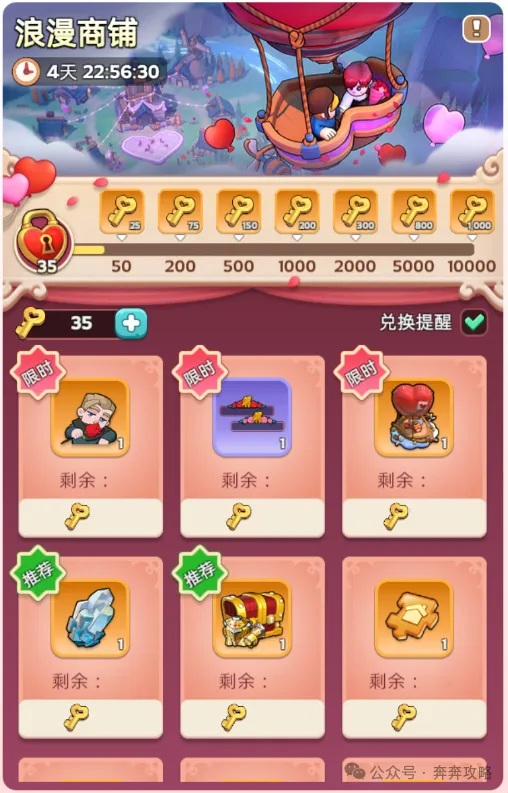 活动期间获得的爱情钥匙可以在浪漫商铺中兑换道具奖励。