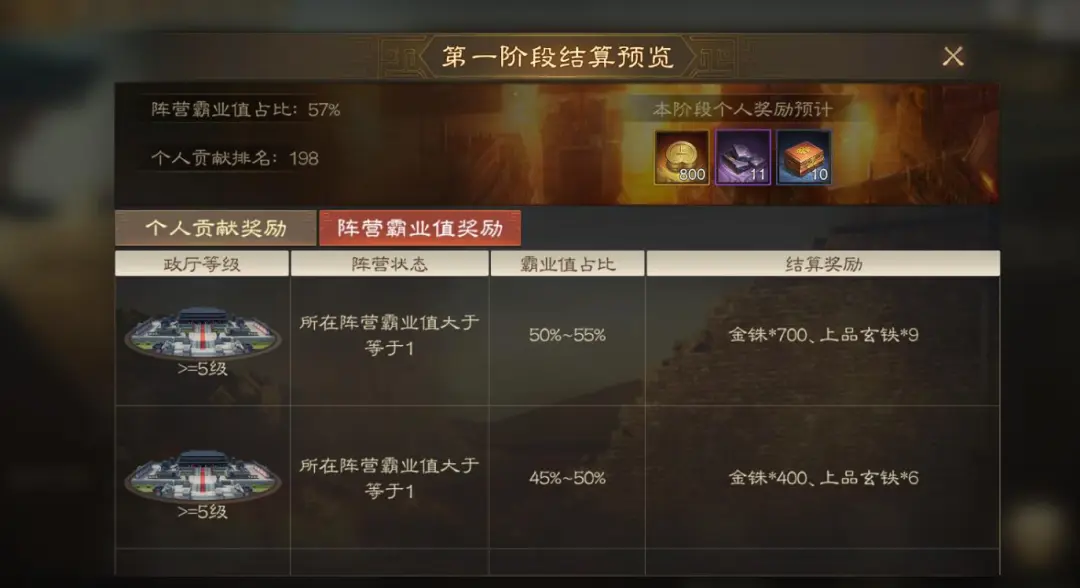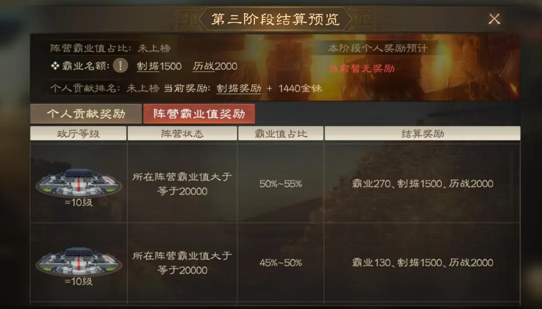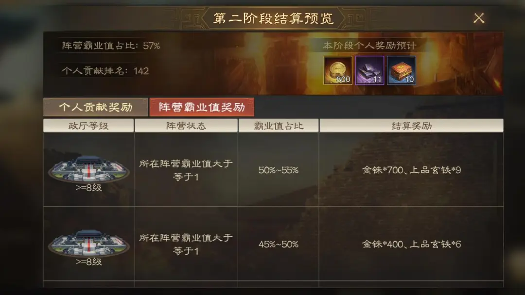 阵营霸业值个人不太能掌控,这个尽力打打就好。第一阶段总体是在京畿地区打,实力平均的就是争夺中间的八级城,实力差距大的可能关门口5个城都要掉两三个。