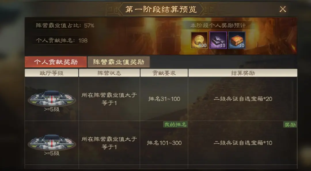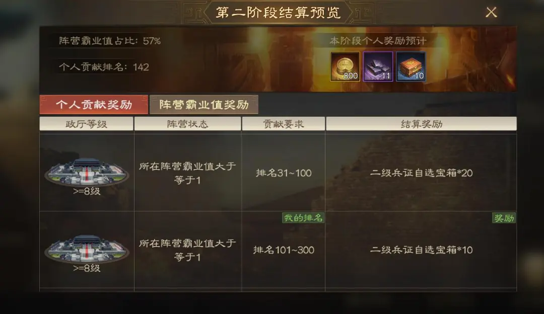 第二阶段的奖励和第一阶段的完全一致,也是有条件尽量打进31-100名,没条件也要保证101-300名的贡献就行。