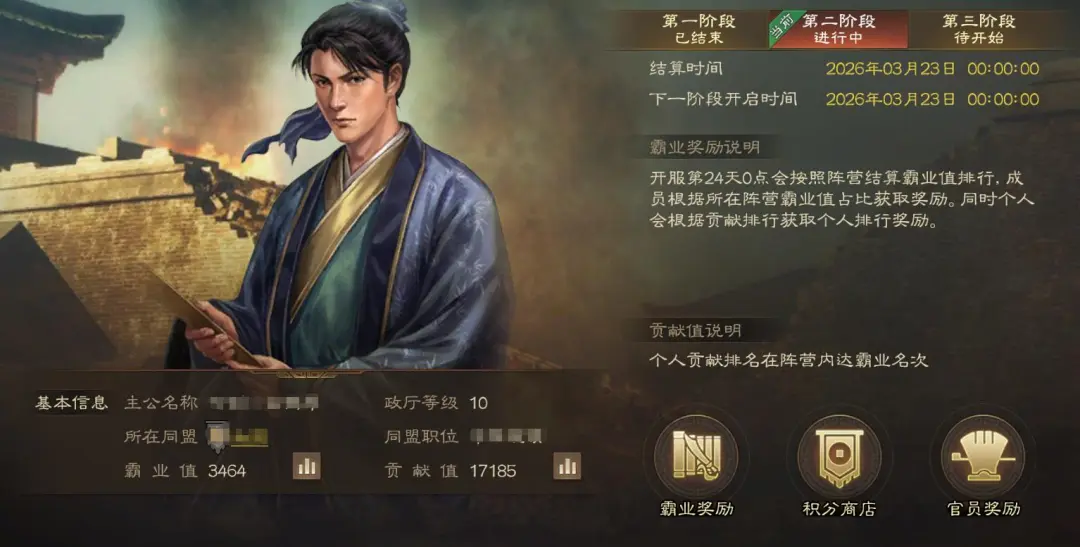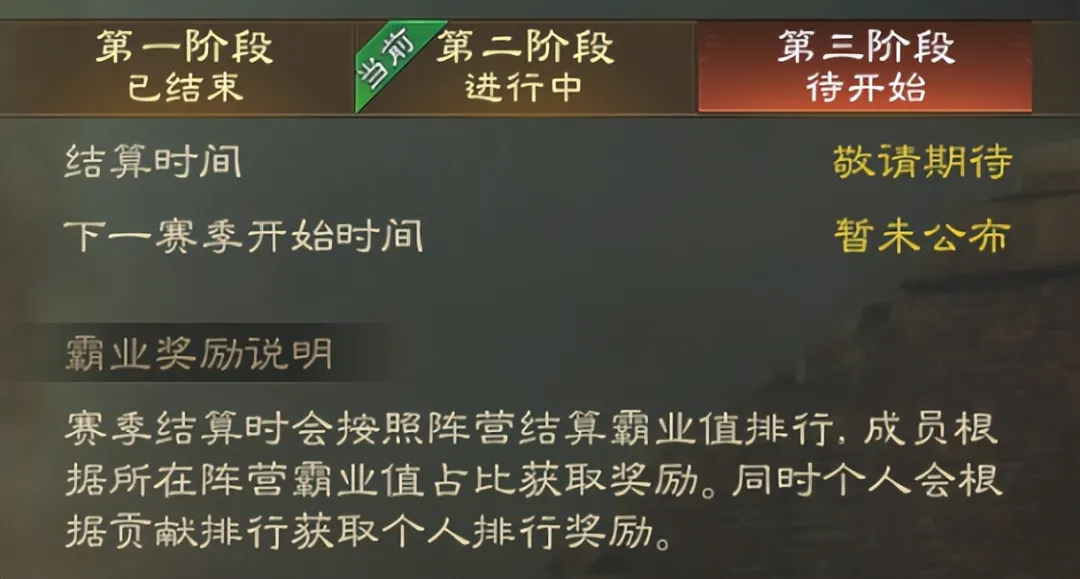 由于本赛季是固定外交,总体的霸业值个人比较难控制,好处是这次对峙和激战阶段都是按阵营算的,尽量多抢几个悬赏城,起码激战阶段拿到的名刺是会比上赛季多很多的。
