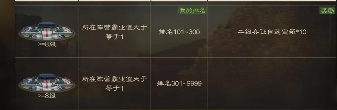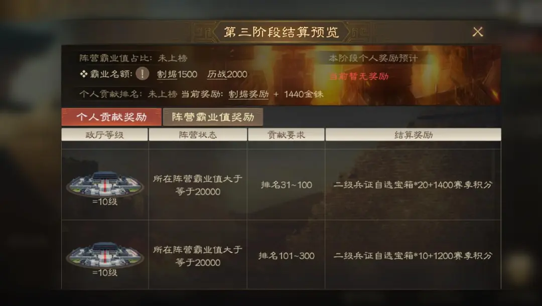 最大的变化来了,现在第三阶段的个人贡献排名还给赛季积分(就是赛季初商店里面能买粮食战法以及各种道具那个商店的货币)。301名之后给900赛季积分,101-300名给10个蓝兵证自选宝箱+1200赛季积分,31-100名给20个蓝兵证自选宝箱+1400赛季积分。