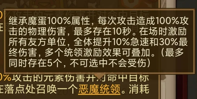 恶魔统领:继承100%属性,攻击也是一样,而且可以激励所有友方单位,+10%急速和30最终伤害